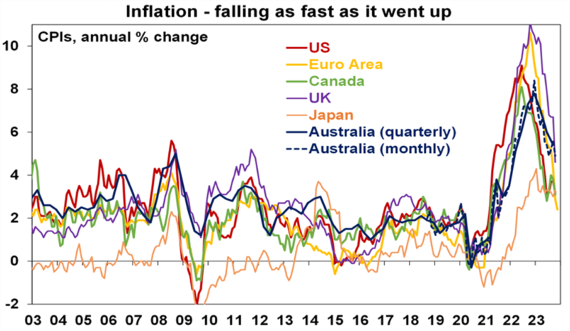 While there has been some angst about Australian inflation (at 4.3% year on year in November) being higher than that in the US (3.4%), Canada (3.1%), UK (3.9%) and Europe (2.9%), this mainly reflects the fact that it lagged on the way up and lagged by around 3 to 6 months at the top. The lag partly reflects the slower reopening from the pandemic in Australia and the slower pass through of higher electricity prices. So we saw inflation peak in December 2022, whereas the US, for instance, peaked in June 2022. But just as it lagged on the way up it’s still following other countries down with roughly the same lag. In fact, with a very high 1.5% month on month implied rise in the Monthly CPI Indicator to drop out from December last year, monthly CPI inflation is likely to have dropped to around 3.3% to 3.7% year on year in December last year, which is more in line with other countries.