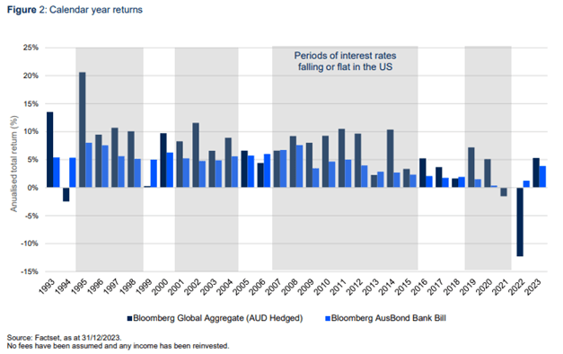 Cash has been one of the best performing defensive assets over the past three years. When compared with global bonds (a riskier asset class), a typical portfolio of term deposits would have returned a cumulative 12.6% in comparison to -8.5% for global bonds over the three years to December 2023. With interest rates expected to stay higher for longer, cautious investors would be right to question whether other asset classes are worth the risk. But are the tides changing?
